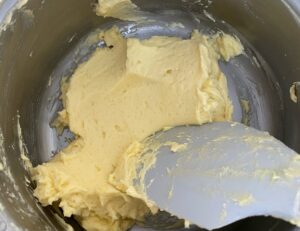 - Add the sugar to the butter in three parts. Mix and whisk until your arm feels sore and the mixture turns pale yellow and fluffy.
